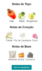 O perfume marcante de Cajueiro transmite as cores, os sabores e a exuberância brasileira. Nas notas de saída, a delicadeza do caju se alia ao frescor do óleo natural da bergamota. O corpo envolto por um buquê floral traz um toque delicado e feminino à fragrância e, juntamente às confortáveis notas de fundo, resultam em uma criação original, alegre e sofisticada.